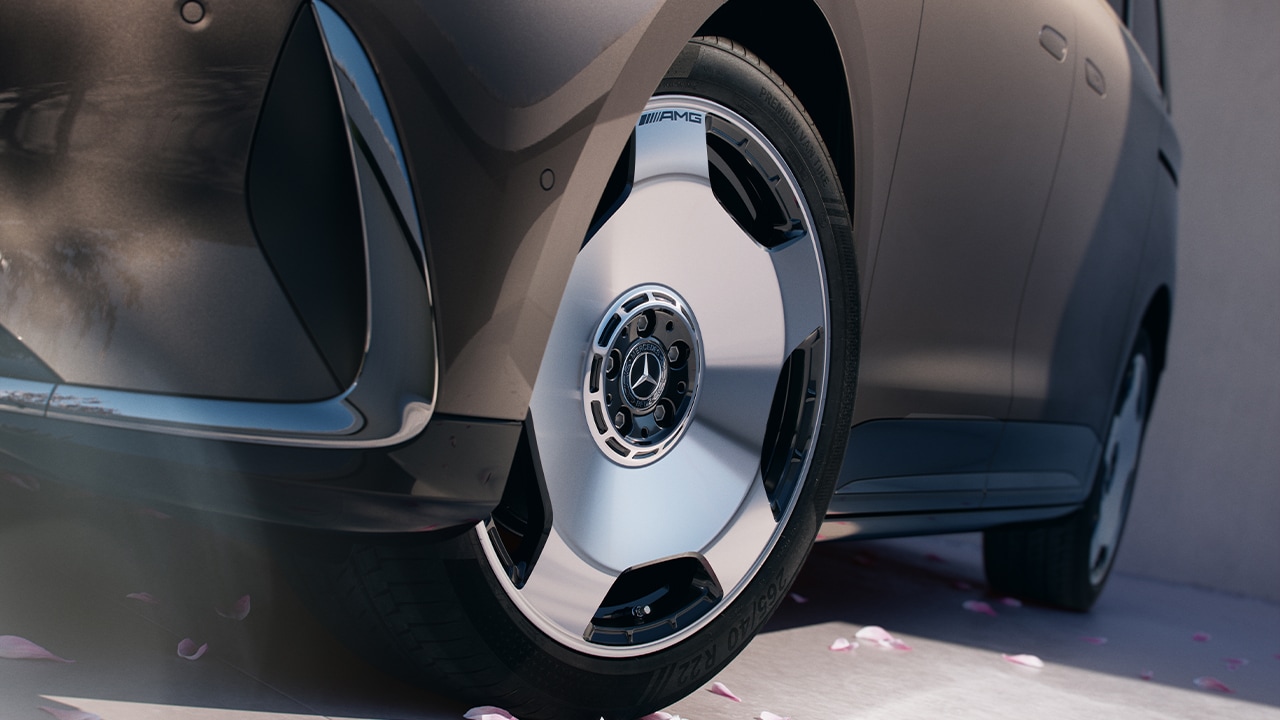 VLE är redan utrustad med 19-tums lättmetallfälgar som standard. Upp till 22-tums AMG lättmetallfälgar finns som tillval.