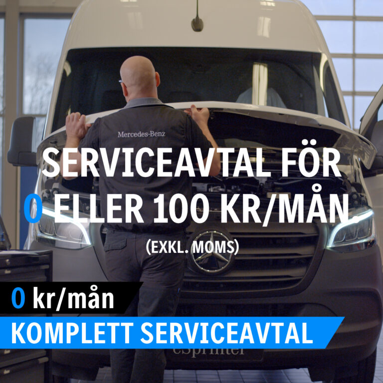 Finansiera din nya diesel- eller eldrivna Vito eller Sprinter via Mercedes-Benz Finans och få vårt mest omfattande serviceavtal för 0 kr/mån. Annars endast 100 kr/mån (exkl. moms). Service, förlängd nybilsgaranti och byte av slitdelar ingår – för ungefär samma kostnad som en burgarmeny och en bit choklad på macken.